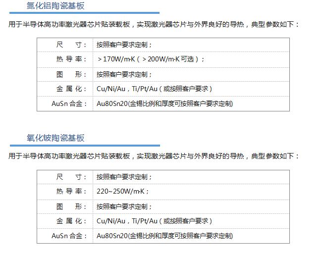 半導(dǎo)體高功率激光器陶瓷基板部分代表性產(chǎn)品性能示例及典型技術(shù)指標(biāo):